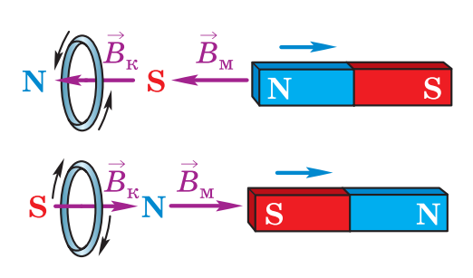 Ток в сплошном кольце создаёт в пространстве магнитное поле, благодаря чему кольцо приобретает свойства магнита. Взаимодействуя с приближающимся полосовым магнитом, кольцо отталкивается от него. Из этого следует, что кольцо и магнит обращены друг к другу одноимёнными полюсами, а векторы магнитной индукции (Bк и Bм) их полей направлены в противоположные стороны.