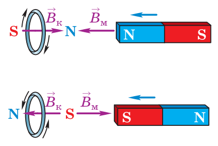 При удалении магнита кольцо будет следовать за ним, притягиваясь к нему. Значит, кольцо и магнит обращены друг к другу разноимёнными полюсами, а векторы магнитной индукции их полей направлены в одну сторону. При одинаковом направлении Bк и Bм магнитное поле тока будет противодействовать уменьшению внешнего магнитного потока, проходящего сквозь кольцо.